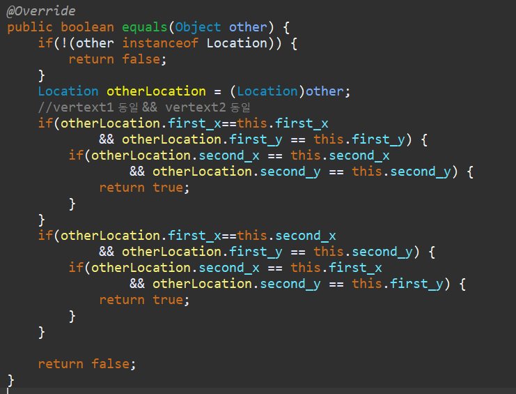 이 클래스에 대한 equals 함수는 아래와 같이 정의했습니다.