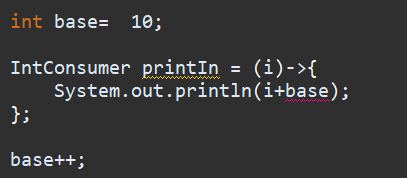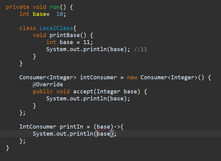 첫번째의 로컬클래스 , 두번째의 익명클래스에선 base라는 변수를 자신들의 scope내에서 재정의하여 사용할 수 있었지만, 마지막의 람다함수에서는 base라는 것을 재정의할 수 없습니다.
