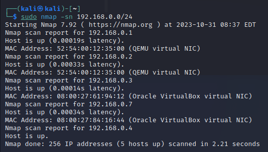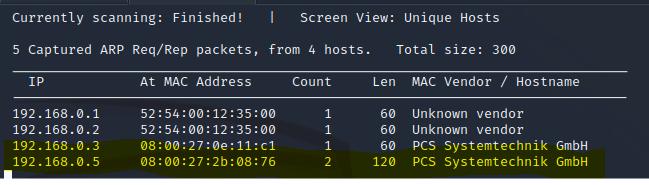 sudo netdiscover -i 인터페이스 -r 192.168.0.0/24 (네트워크)