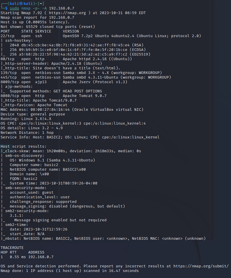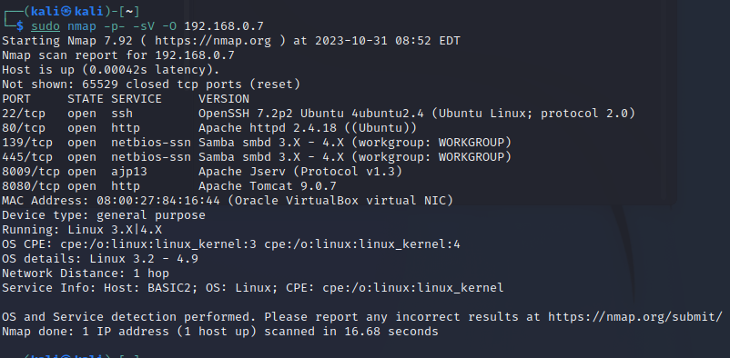 그럼 이제 칼리리눅스에서 공격대상(여기선 basic pentesting 환경)을 식별해보겠습니다.