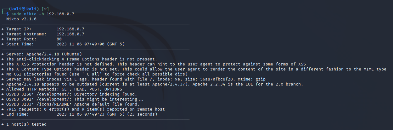 nikto 란 웹서버를 스캐닝하는 도구로 취약점 스캐닝을 통해 잠재적 위협이 될만한 요소들을 사전에 대처할 수 있는 목적을 두고 있습니다.