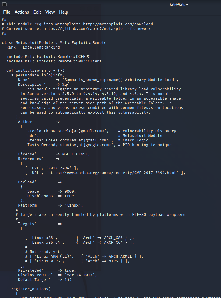 검색된 결과의 취약점을 상세히 보려면 -x 옵션과 검색결과의 번호를 입력하면 됩니다.