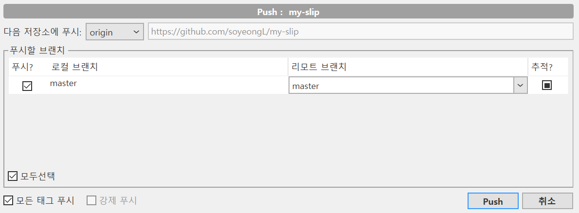푸시를 할 때에는 로컬과 원격이 모두 master로 일치시켜 로컬에 있는 것이 git으로 올라갈 수 있도록 해야합니다.