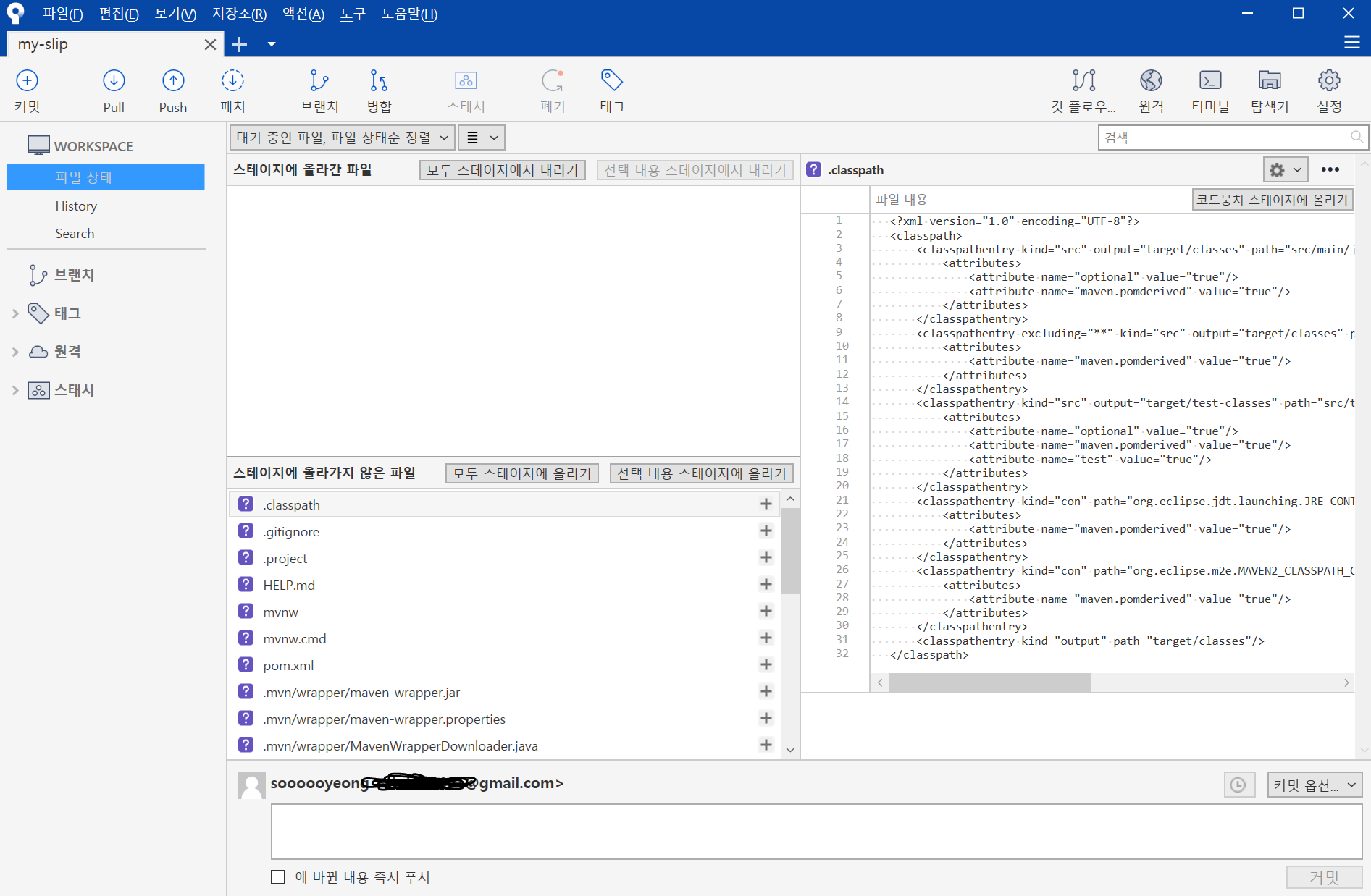 이때 .classpath와 같이 github에 굳이 올리지 않아도 되는 파일 같은 경우 우클릭 > 무시 를 통해 올리지 않으시면됩니다. 이렇게 ignore 된 파일은 .gitignore 파일에 추가된 것을 볼 수 있습니다.