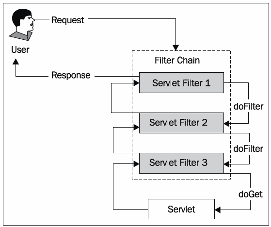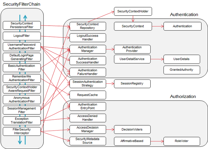 User가 request를 보낼 때 Spring Security 를 사용하지 않는다면 Servlet으로 바로 가지만 Security 사용시 default 12개의 필터로 가게 됩니다. 이 필터에 대한 보다 자세한 그림은 아래와 같습니다.