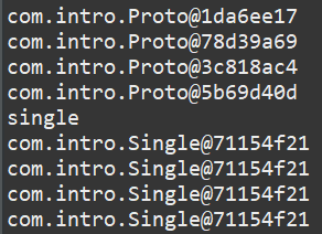 그런 후에 아래와 같이 각 빈을 호출해보면 Proto는 매번 다른 인스턴스를 만들어서 보여주는 것을 볼 수 있으며 Single은 항상 같은 인스턴스를 보여주고 있습니다.