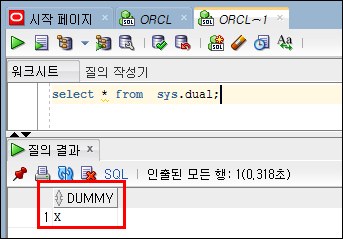 DUMMY 라는 VARCHAR2(1) 컬럼에는 X라는 값이 들어있는 행을 1건 포함하고 있습니다.
