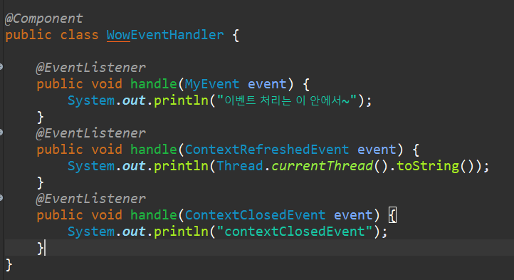 그리고 이벤트를 처리할 메소드 위에 @EventListener라는 annotation을 달아주면됩니다.